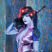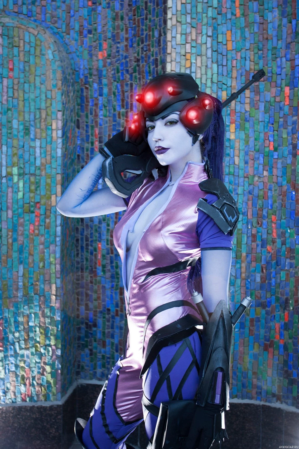 The image features a person dressed in cosplay as Widowmaker, a character from