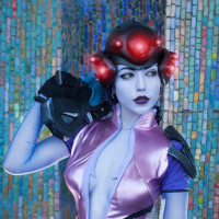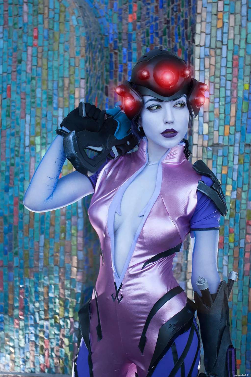 The image shows a person dressed in a cosplay outfit that resembles the character Widowmaker from