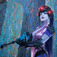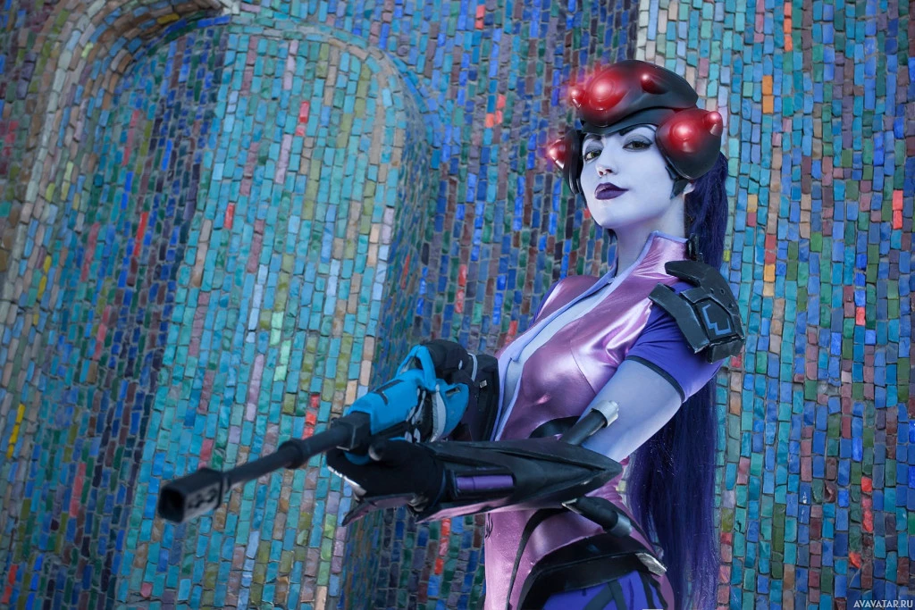 a character from the game "Overwatch," known as Widowmaker. She is depicted in her cosplay attire, which includes a pink and black body suit, a helmet with