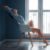 the edge of a bed with her feet up and resting against a wall, which is painted blue. She appears to be stretching or possibly dancing in a relaxed posture, facing towards an open window that allows