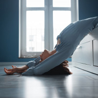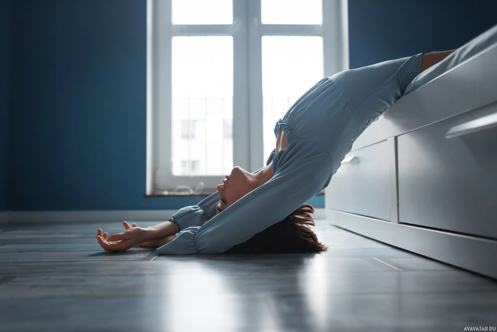 wooden flooring and a neutral color palette. The person is looking up towards the ceiling. The overall atmosphere of the photo seems calm and introspective.