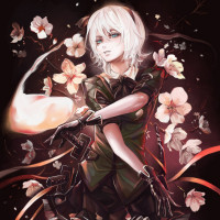 cherry blossoms and darker elements, possibly representing a contrast between life and decay or darkness and light. The background has