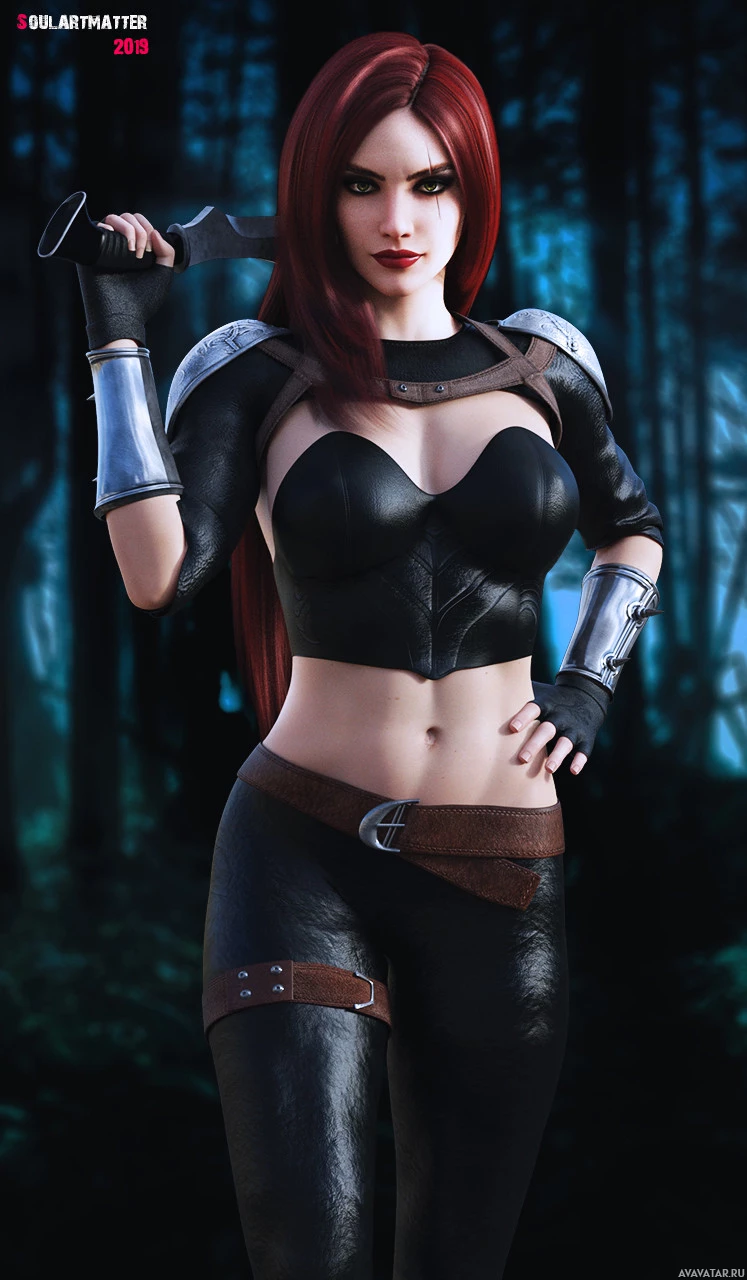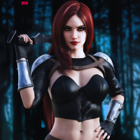 red hair and is wearing black attire with elements of leather or armor, suggesting she could be a warrior or fighter type of character. In her hands, she holds a sword, further emphasizing her combat-oriented appearance. The setting appears to be