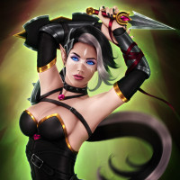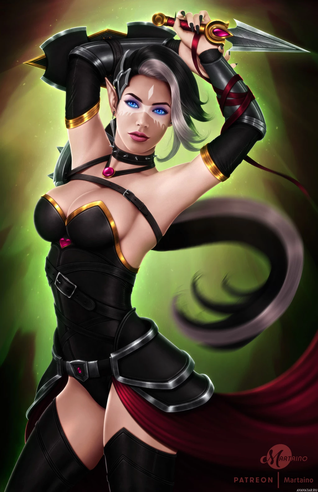 dark armor with a cape, and she has a sword in her hand. Her hair is styled with one side swept to the side. There are fantasy elements in the background that suggest a magical or enchanted setting. The style appears to be inspired by