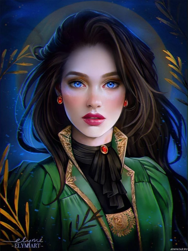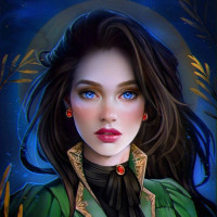 blue eyes and is wearing what appears to be an intricate, green outfit with a dark collar. The background suggests a nighttime setting with a dark,