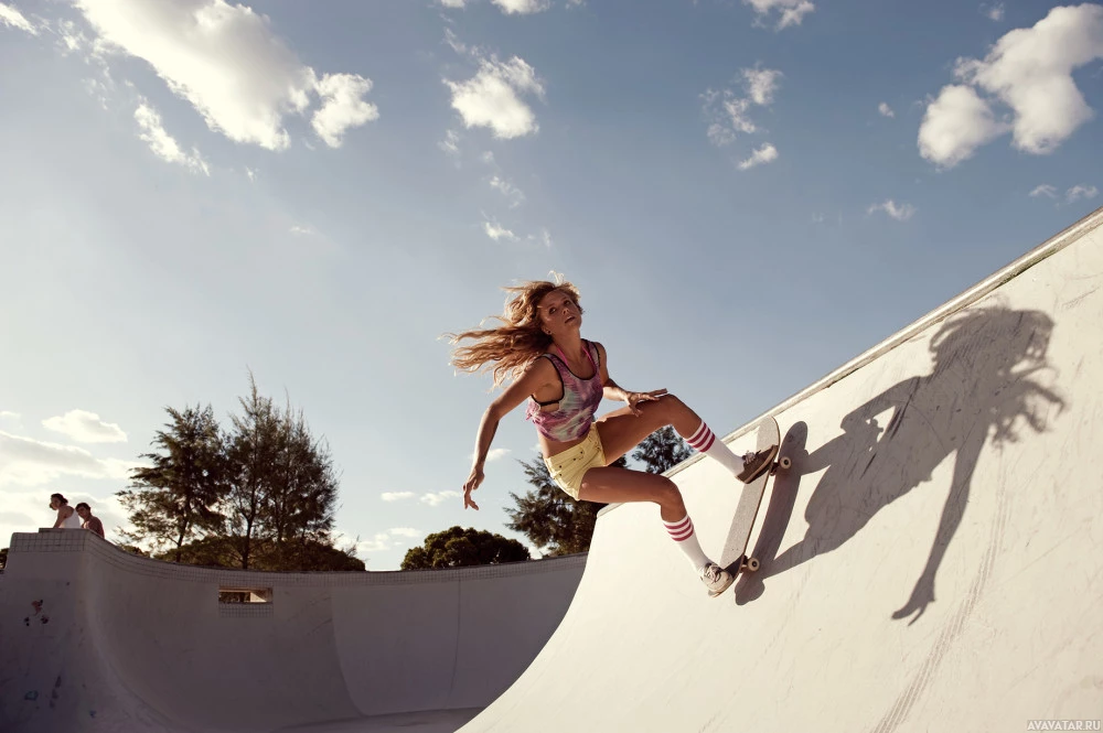 The image shows a woman skateboarding on a ramp, with her arms outstretched for balance. She appears to be in motion and is wearing