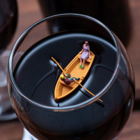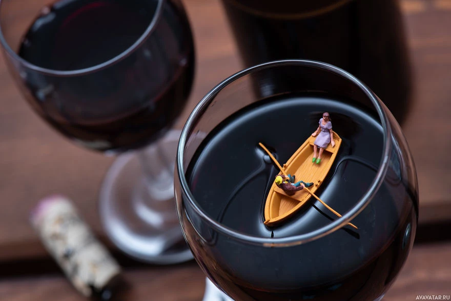 model boat with two figures on it, one at the back and one in the middle, as if they are rowing the boat. The figures seem to be a man and a woman. There is another wine glass next to it, also containing wine. In front of these glasses, partially obscured by the glasses, there appears to be a small