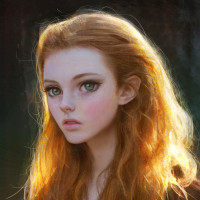 an outdoor setting with a soft, diffused lighting effect, which could imply a portrait painted with the use of artificial lighting techniques to enhance the subject's features. The style of the image is reminiscent of classical or fantasy artwork, emphasizing her face and expression as well as her hair color, which are often key elements in such portraits.