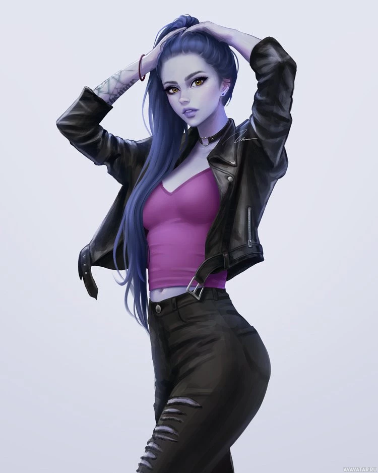 long hair in a bun, and wearing a black leather jacket over a purple top. They are also wearing jeans with rips along the sides. The style of the image suggests it could be an illustration or