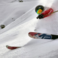 protective gear including a helmet, googles, and what seems to be a racing suit with sponsor logos. The skier is creating a spray of snow as they move at