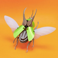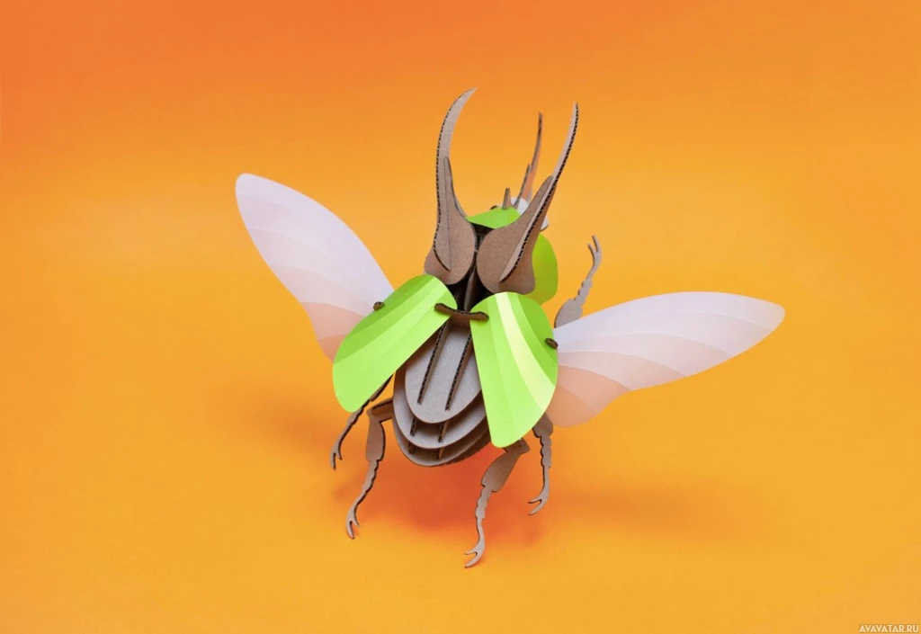 На снимке показана трехмерная бумагоделия жука. Он имеет типичный вид жука с твердым телом, усами и крыльями, которые сложены над его спиной. На теле также есть зеленый дизайн, который может предложить какой-то естественный камуфляж или мимикрию рисунка, чтобы запутать хищников. Это ремесло демонстрирует художественное изображение насекомого, вероятно, созданное для показа или образовательных целей.