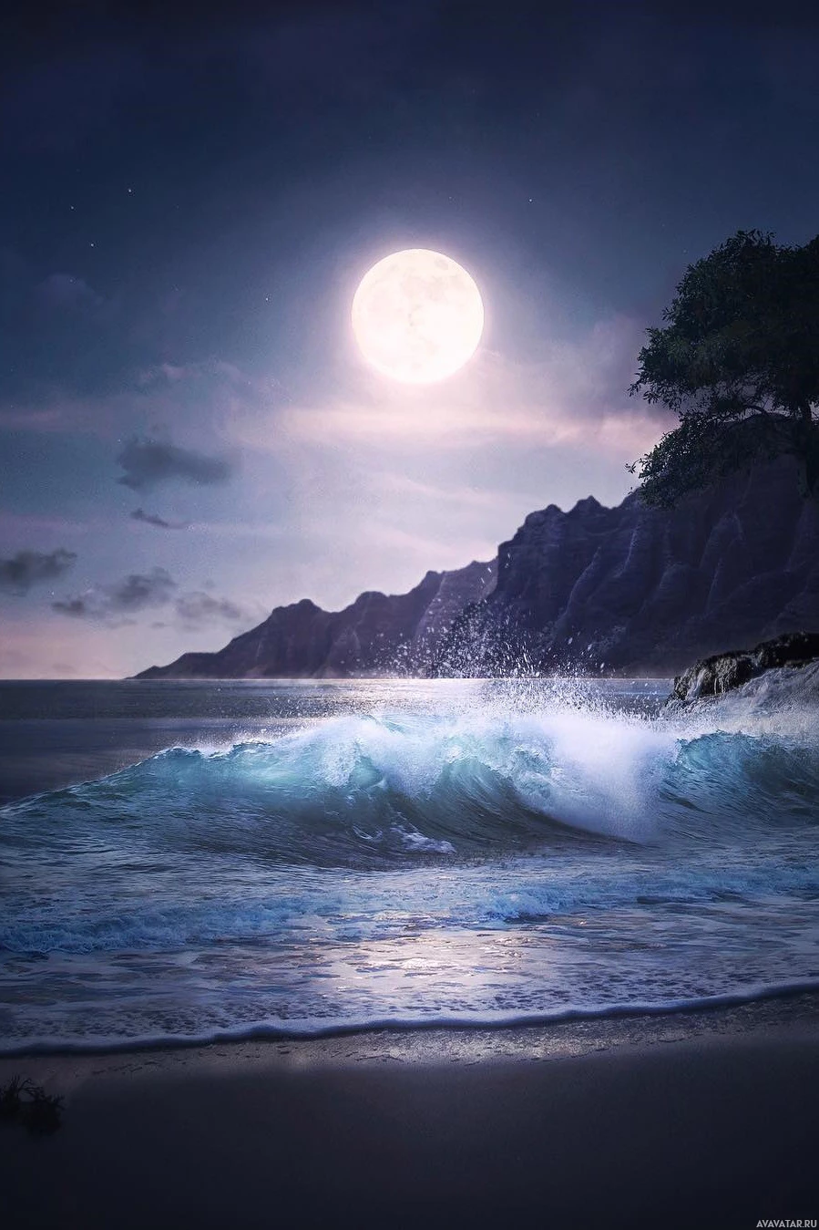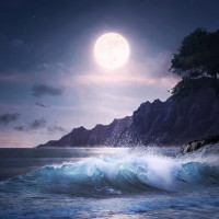 На картинке изображена ночная сцена на пляже. Полнолуние освещает пейзаж, бросая яркое свечение на песок и воду. Рядом с берегом ломаются небольшие волны. На заднем плане, кажется, есть скалистая береговая линия или скала с зеленью, возможно, кустарники или деревья. Общая атмосфера изображения предполагает спокойствие и уединение под ночным небом.