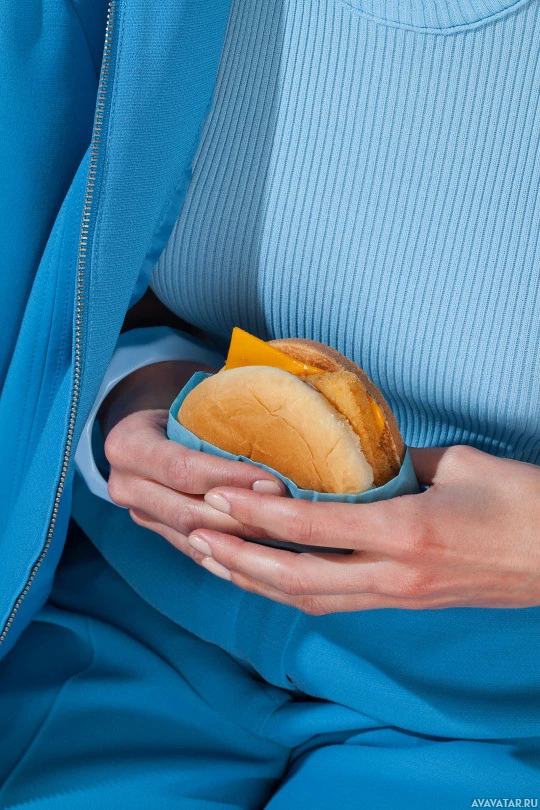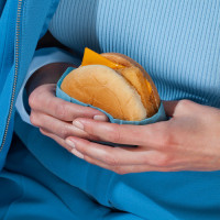 The image shows a person holding a sandwich or burger in their hand. The food is likely inside some kind of paper or container, and the individual appears to be wearing