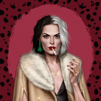 a fur coat and holding a cigarette in her hand. The background is a vibrant mix of red and black colors, providing
