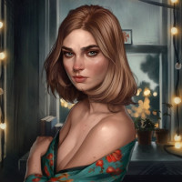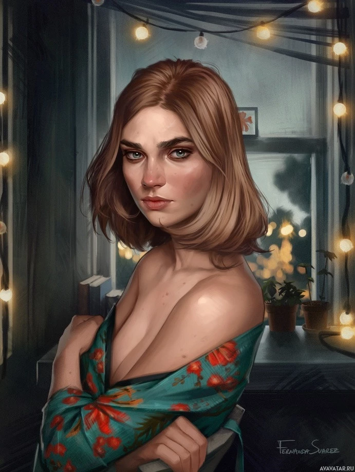 floral designs on it, and her expression appears to be contemplative or introspective. The setting suggests a cozy indoor environment at night, possibly in a cafe or bar, as indicated by