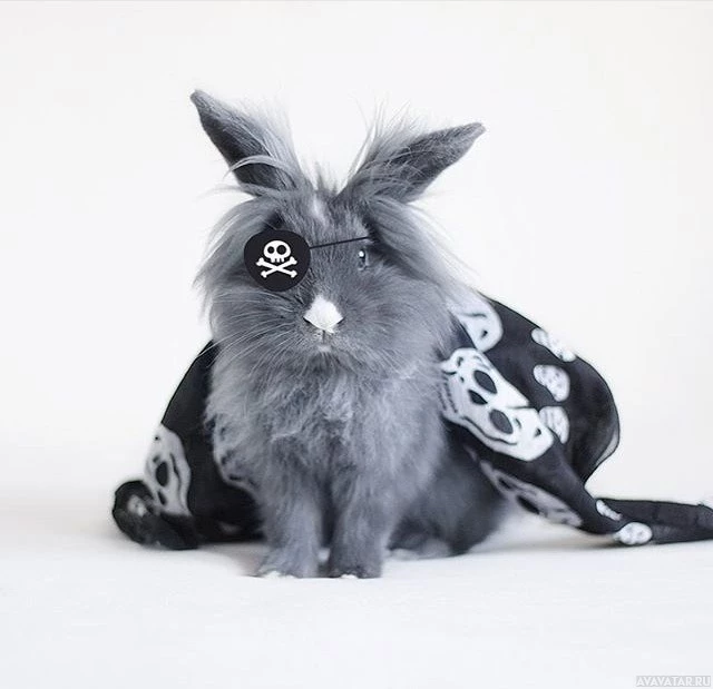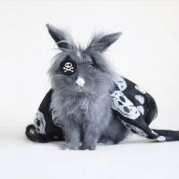 The image shows a rabbit wearing pirate-themed accessories. The rabbit has a bandana tied around its head, which appears to be decorated with skull and crossbones, resembling