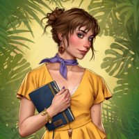 a soft expression on her face, looking slightly downward as if she's deep in thought or perhaps reading something from the book she holds open with both hands. The background suggests a jungle setting with