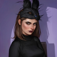 a black top and a black mask that covers the upper part of her face, leaving only her eyes visible. Her expression appears thoughtful or intense. She has