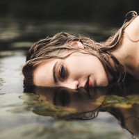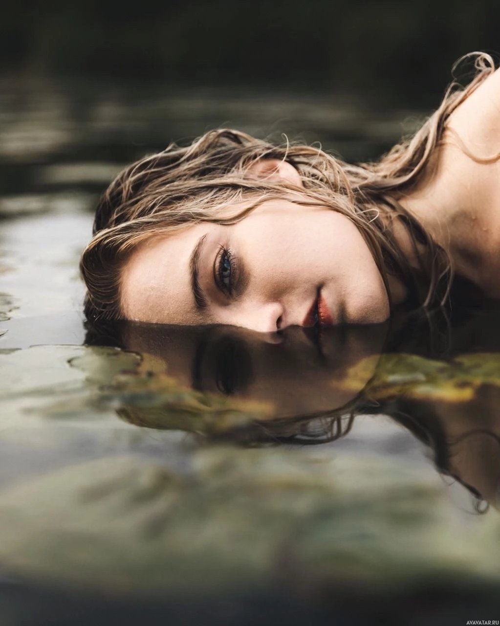 На картинке изображена молодая женщина, погруженная в воду до плеч. Она, кажется, смотрит вниз к поверхности воды. Ее отражение можно увидеть на поверхности воды из-за ее близости и угла фотографии. Помещение кажется безмятежным и естественным, возможно, озеро или пруд.