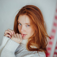 red hair who appears to be looking directly at the camera. She has her hands clasped near her neck and is wearing a white,