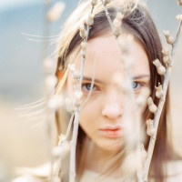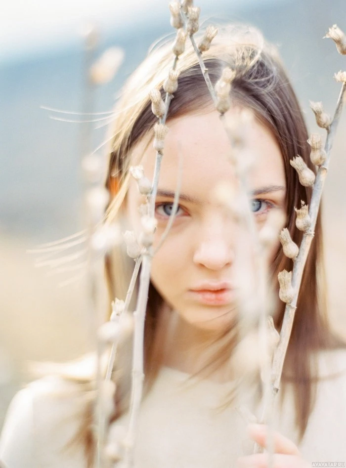 a young woman with fair skin, long hair, and she appears to be looking off to the side with a neutral expression. She is holding what looks like dry grass or twigs near her face, which creates an artistic