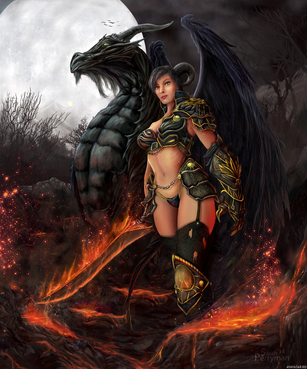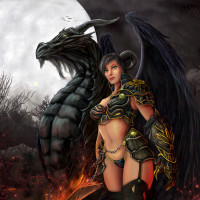game designs. She has wings like an angel or demon and is holding what appears to be a staff or wand in her hand. Behind her is a creature that looks like a dragon, adding to the fantastical theme of the artwork. The setting suggests a scene from a mythological or fantasy-