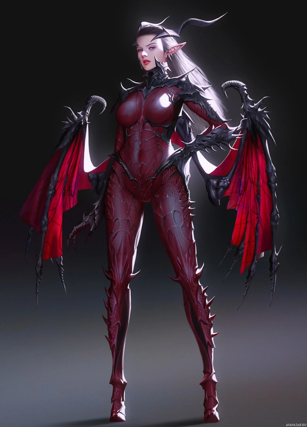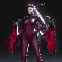 a creature from fantasy and mythology known for its seductive nature. This particular depiction of a succubus has a humanoid form with distinctive red and black coloration, including large wings that are typical of
