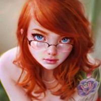 The image shows a stylized illustration of a red-haired girl wearing glasses. She has a tattoo on her arm and is adorned with various other decorative elements, such as what appears to be a floral design on one shoulder and possibly some additional