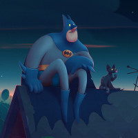 a small bird perched on a wire above Batman's head. The overall tone of the image is whimsical and lighthearted, with a cartoonish illustration style that differs from the more realistic depictions often seen in