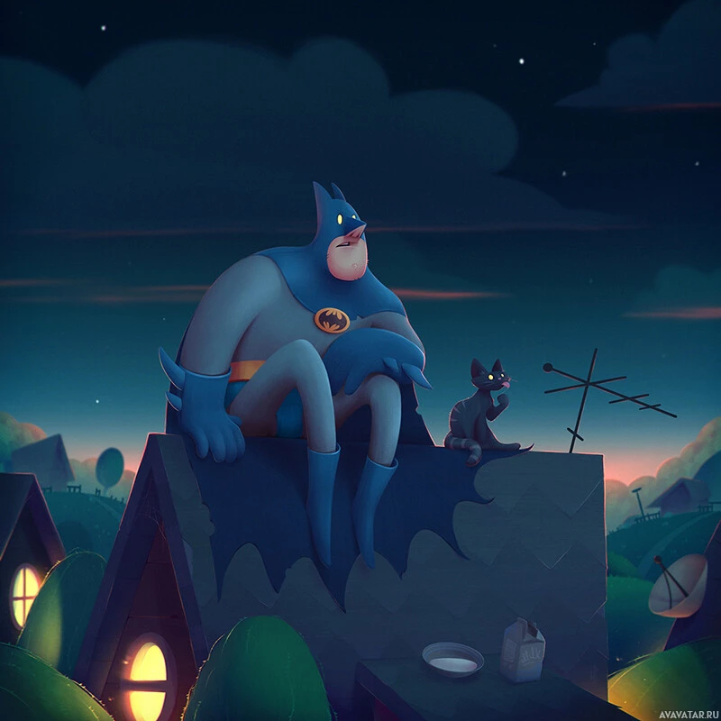 The image features a stylized illustration of Batman sitting on a rooftop under