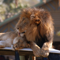 The image shows a lion sitting on what appears to be the back of a vehicle, with another lion lying down beside it. They seem to be in a natural setting that might be close to their habitat or an enclosure designed for them.