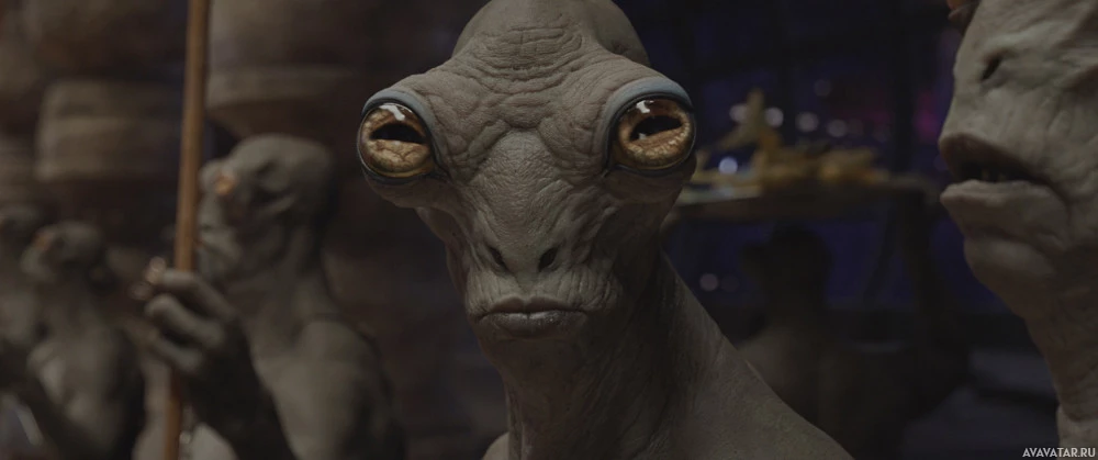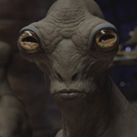 an iconic figure from the series. The scene appears to be set in what looks like a cantina or bar setting, with a group of other
