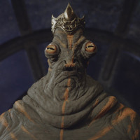 a humanoid alien with distinctive facial features and attire that include a crown and ornate robes. This character is well-known within the Star