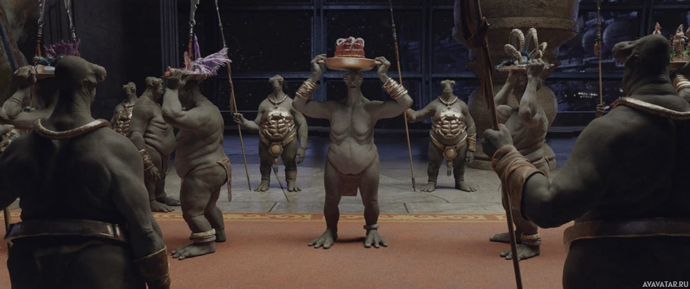 various characters in what looks like a feast or celebration setting. In the center, there is a large