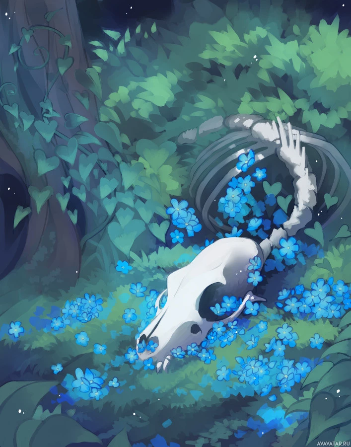blue flowers that are growing amongst the leaves, creating a contrast between the natural elements and the symbolic representation of death. The background suggests a forest or jungle setting with trees and more foliage. This image could be related to themes such as nature, life and death, or