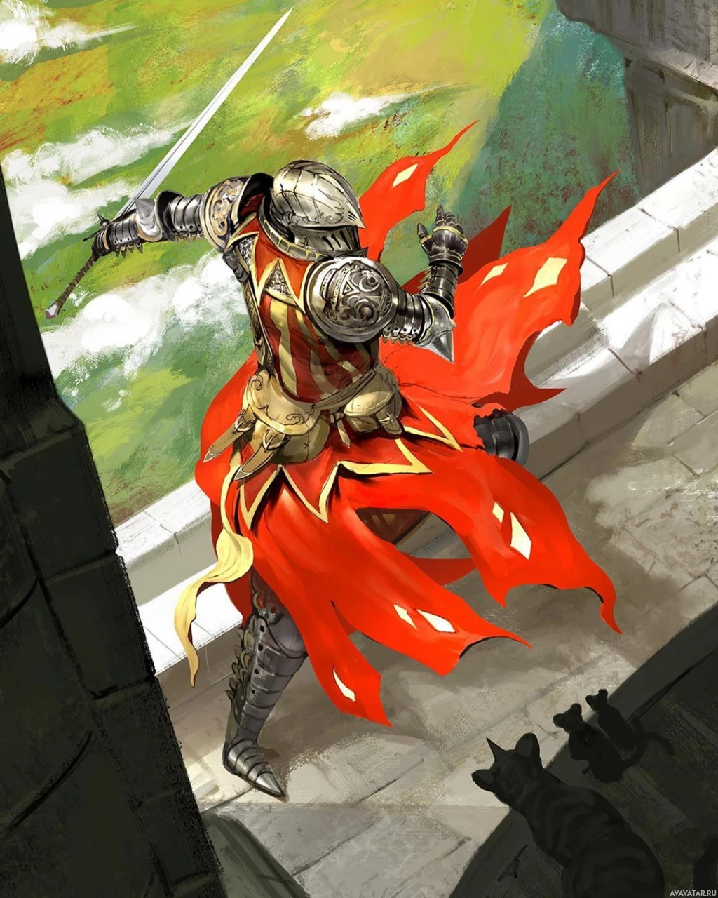 a dynamic stance, suggesting they might be in the middle of an action or battle. The warrior is wearing red and gold armor with a cape flowing behind them, indicating movement. The background appears to be