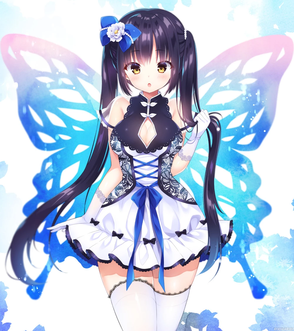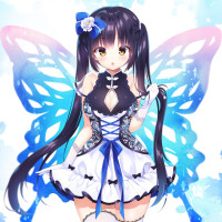an animated character who appears to be a female with brunette hair. She is wearing a costume that gives her butterfly wings, and her outfit seems to have elements of a fairy-like or magical theme, including what looks like a tiara and a bow. The color scheme includes shades of blue, white, and black. There are also hints of blues in the background, which might be interpreted as