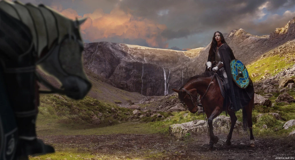 long hair and seems to be dressed in a cloak with intricate designs on it. Both characters appear to be in a landscape that suggests they might be in a rural or mountainous area during what could be early evening, given