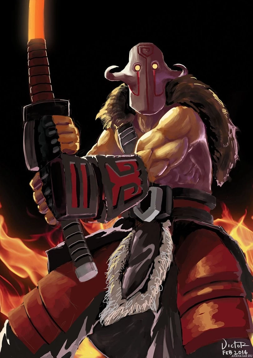 The image features a character from the game Dota 2, specifically Juggernaut. This character is known for his role as a melee carry and for his ability to charge into enemies at