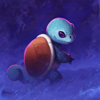an animated scene from the Pokémon franchise. In the foreground, there is a small Squirtle, which is one of the starter Pokémon in the series, known for its distinctive blue and orange color scheme. Behind Squirtle, there's a silhouette that resembles a larger creature or Pokémon, suggesting it might be a powerful or intimidating figure within the context of the story. The background has a vivid