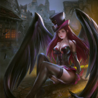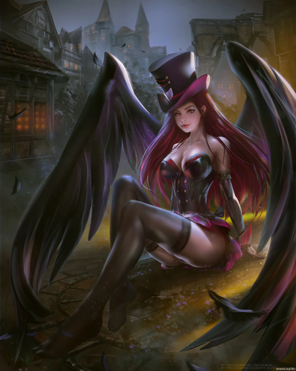 Картинка показывает цифровую иллюстрацию персонажа, который, кажется, из жанра фэнтези. У нее рыжие волосы и она носит черную верхнюю шляпу с крыльями, прорастающими из ее спины. Расположение выглядит как старая мощеная улица в средневековом городе ночью, освещенная фонарями и лунным светом.