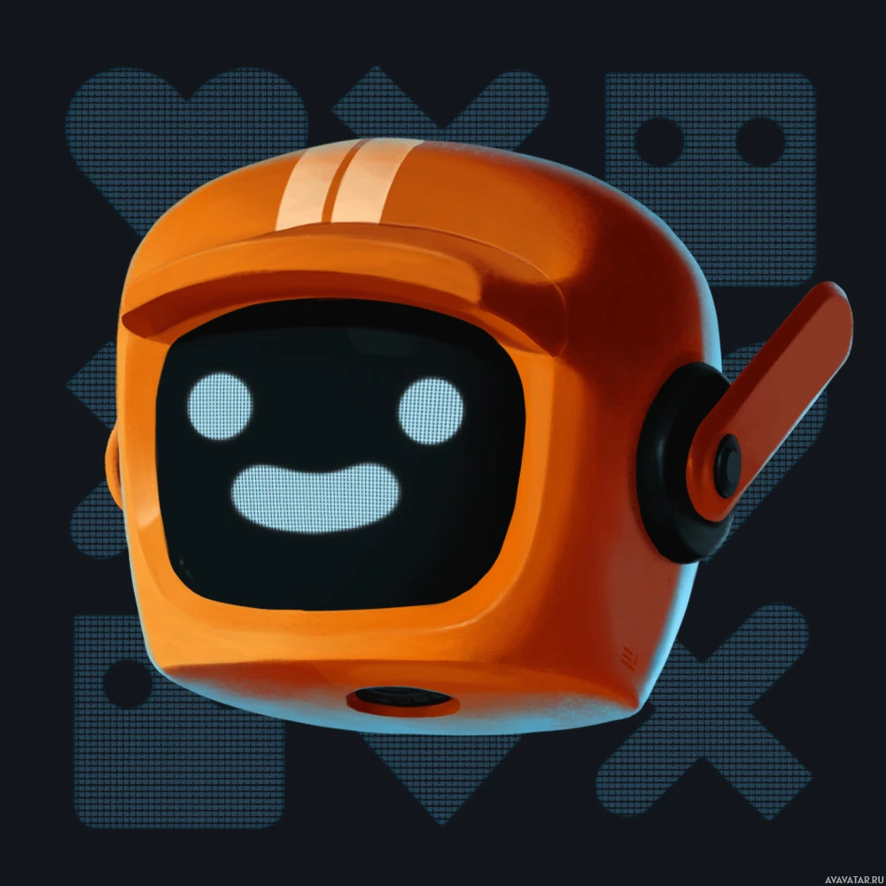 a smiling face and is colored in shades of orange, red, white, and black. The robot's design suggests it might be part of