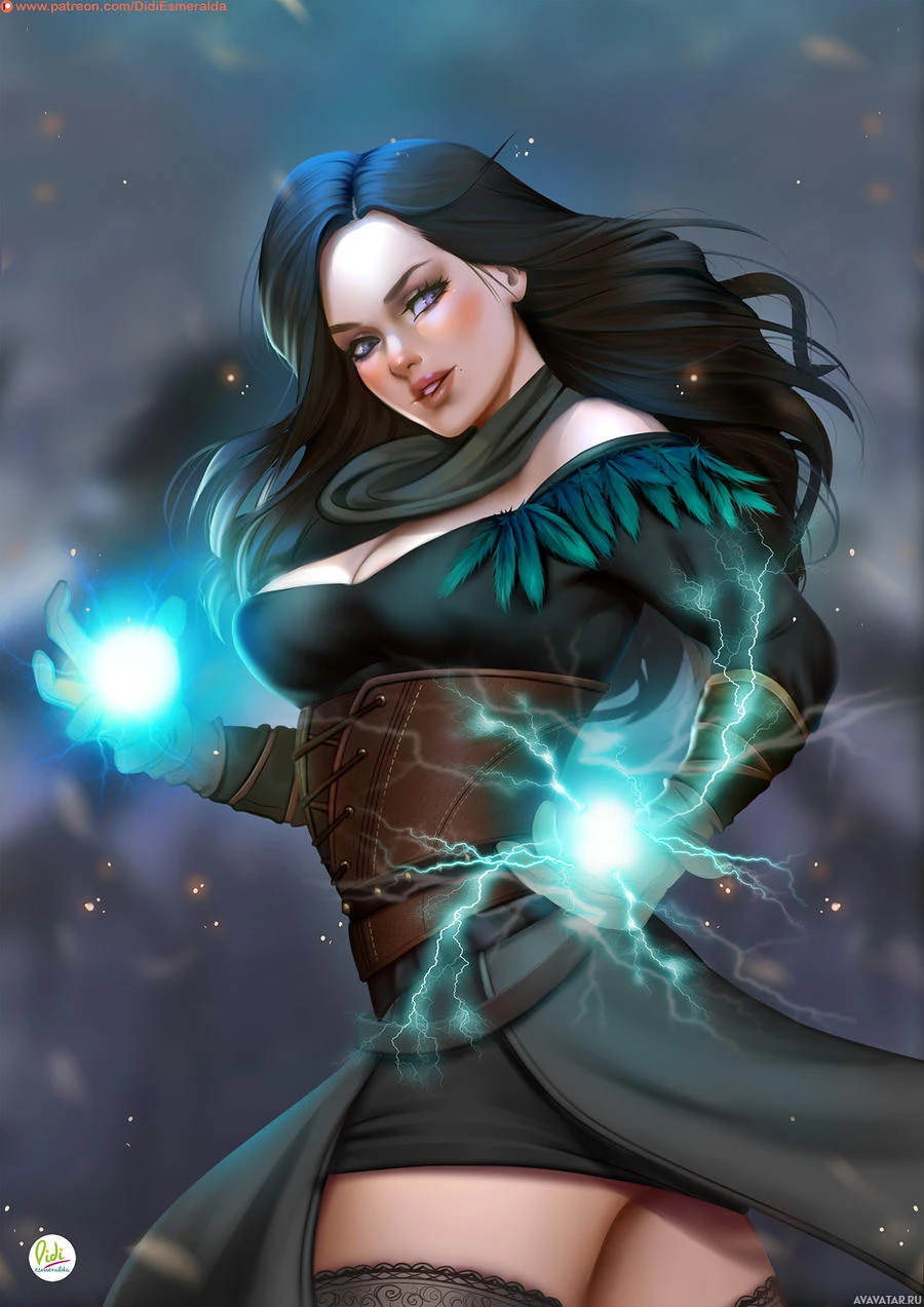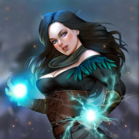 blue eyes, wearing a black outfit adorned with feathers and an intricate belt. In her hands, she holds two glowing orbs that are connected by a stream of electricity, suggesting the character might be casting a spell or performing some