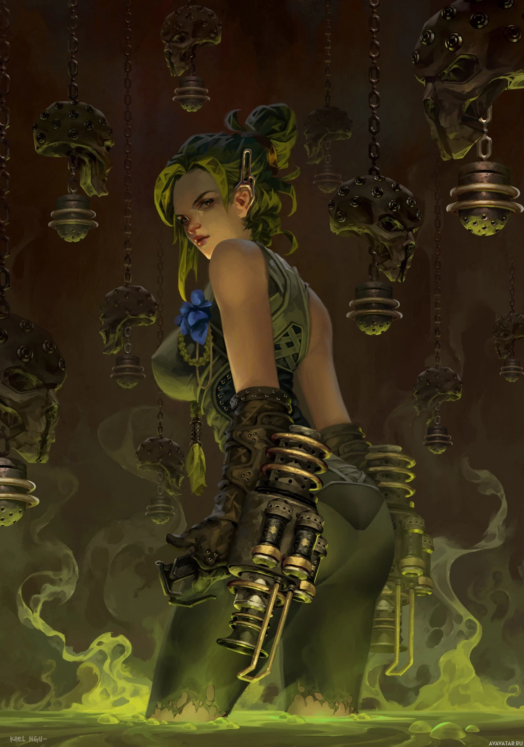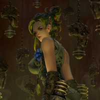 a female character. She has green hair and is dressed in a steampunk or cyberpunk-inspired outfit with mechanical elements, suggesting she may be involved in some form of