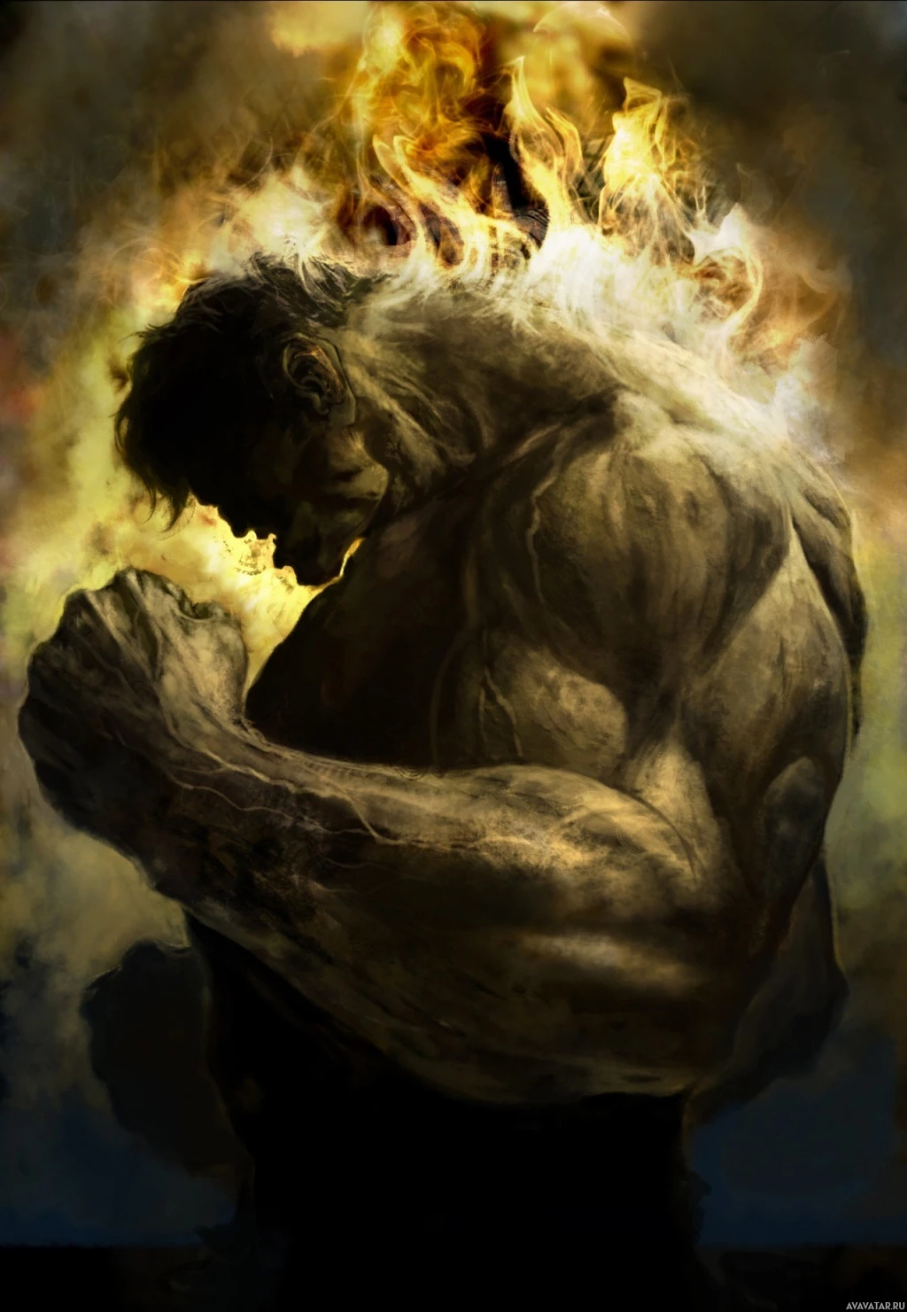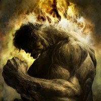 The image features a character known as the Hulk. He is depicted with muscles bulging out from his skin, and he appears to be in a state of intense emotion or focus, possibly anger or determination. Flames are visible behind him, adding to the dramatic effect of the image.