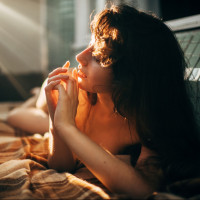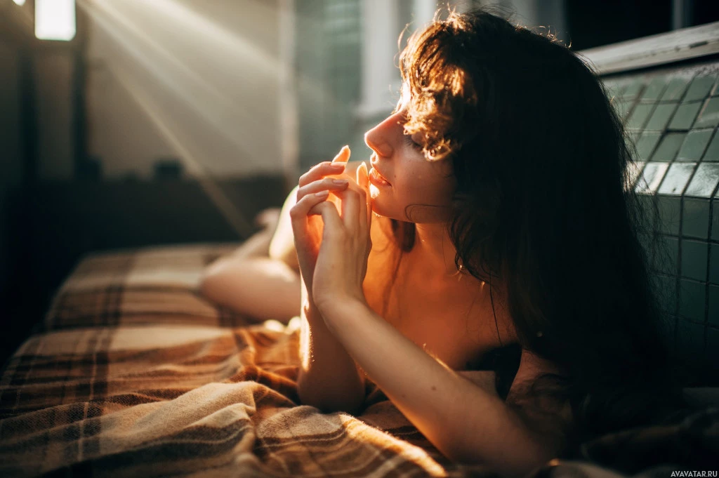 The image shows a woman lying on her stomach on a bed. She appears to be resting or relaxing, with one hand placed under her cheek, possibly supporting her head as she looks away from the viewer. The lighting in the photo suggests it might be taken during sunrise or sunset, given the warm tones on the wall and