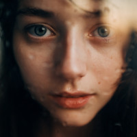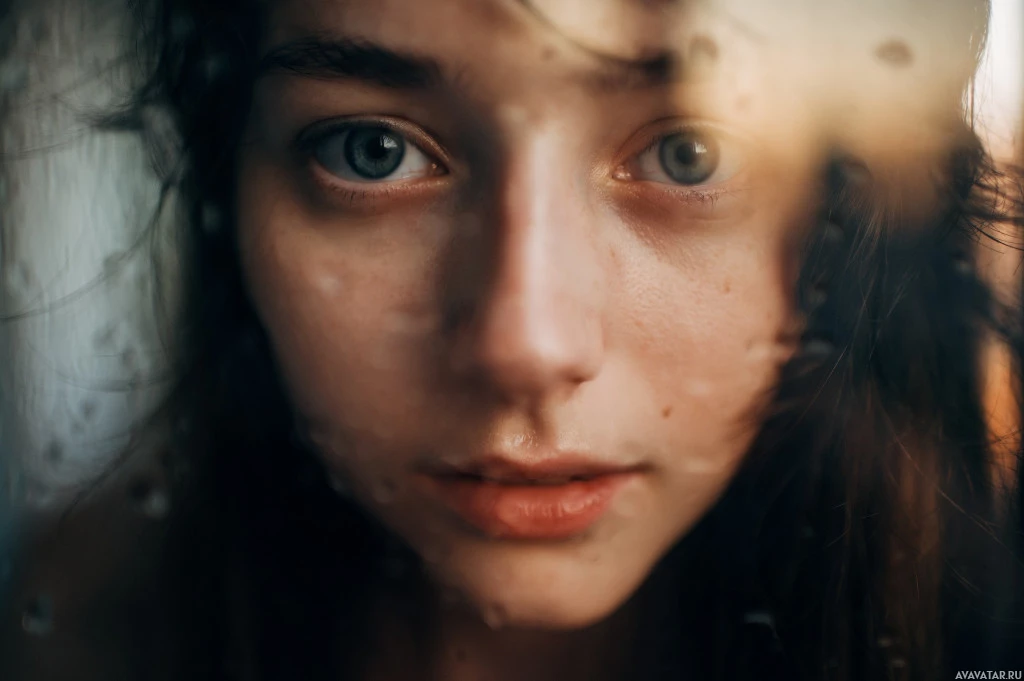 long hair that falls over her shoulders, and it appears to be raining outside since there are droplets visible on the window pane through which she is seen. The woman's complexion is fair, and she appears to have