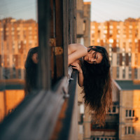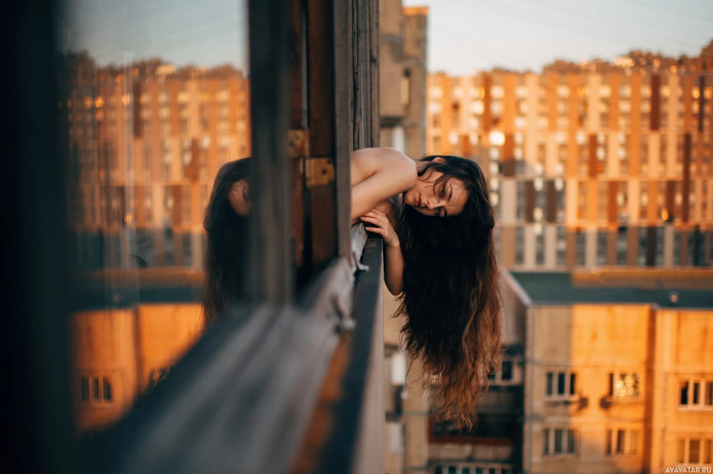 long hair, leaning out of an open window. She appears to be in the upper floors of a building, as her reflection is visible on the surface below. The setting suggests it might be evening or