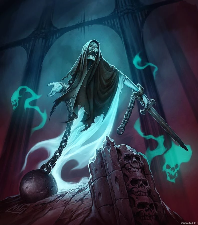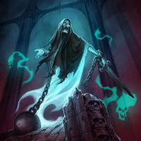 hooded cloak with chains dangling from its waist, giving off an ominous and mystical vibe. The background features Gothic-style architecture with