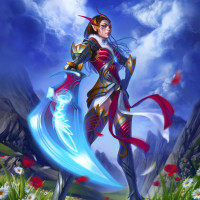a fantasy character, who appears to be an elf. She is holding a sword with both hands and is dressed in armor that combines elements of blue and red, with some gold accents. There's also a cape or draped fabric on her shoulders. In the background, there are rocky outcroppings and a few scattered flowers, which suggests a natural setting for this